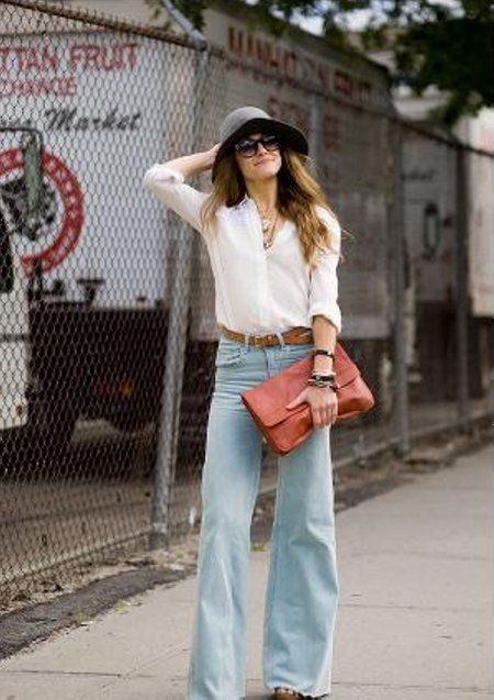 The easiest and probably the most classic outfit ever! High waist, flare leg denim can be worn with all sorts of tops – cropped sweater, silk tunic, fitted henley, white t-shirt ,and of course, a button-up top.