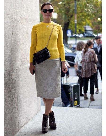 Bright citrus colors are in for Spring! Pair a bright top with a structured pencil skirt and heels for a classic lady-like look. I love how the woman above spiced things up a bit, by adding chunky lace-up boots.