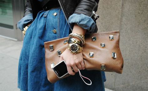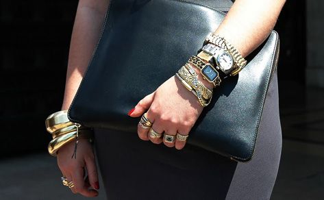 Unless you live under a rock, you’rre probably aware of the accessories trend of layering oversized watches and bracelets (as pictured below). The look has been persistent on street style blogs, runways and fashion magazine alike. Women are stacking their wrists with mismatched materials, finishes, colors, band widths, etc. The look can be overdone VERY quickly, so ladies be cautious about the other accessories (ie. rings, necklaces and earrings) you wear with the stacked wrist look.