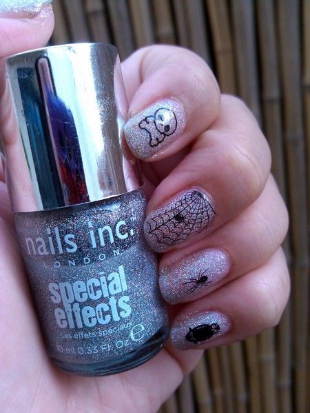 In this case, the background nail polish color can be anything as long as its in a neutral or light color to give contrast to the black & clear accent decal. I choose Special Effects Holographic Glitter by Nails, Inc as the background.