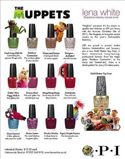 The collection includes: Fresh Frog of Bel-Air (clear with green glitter), Rainbow Connection (clear with multi-colored glitter), Warm & Fozzie (warm copper), Designer De Better (metallic bronze), Gettin’ Miss Piggy With It! (red glittery), Excuse Moi! (pink glitter), Meep-Meep-Meep (deep fuschia), Animal-istic (wild red), Gone Gonzo! (blue glitter), Divine Swine (magenta glitter), Wocka Wocka (deep berry) and Pepe’s Purple Passion (best purple ever!)