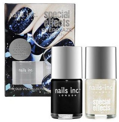 The duos are: The Donmar Collection (Chelsea plum black polish, with Donmar Overglaze top coat which contains hand-cut, irregular particles in red and green), The Wyndham Collection (Kensignton teal black polish, with Wyndham Overglaze top coat which contains hand-cut, irregular clear particles) and The Old Vic Collection (patent black Black Taxi polish and The Old Vic Overglaze top coat with UV blue holographic particles)