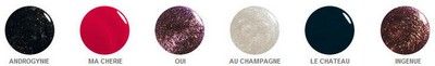 The collection includes: Androgynie (glittery black), Ma Cherie (red berry), Oui (glittery pink/purple), Au Champagne (glittery champagne), Le Chateu (navy blue) and Ingenue (glittery copper).